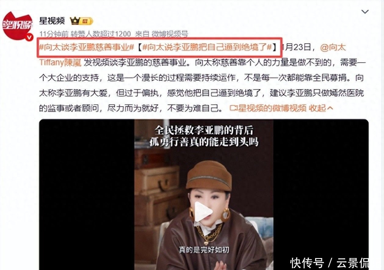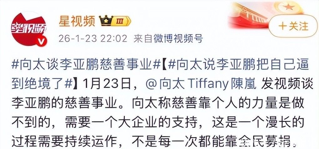 1月25日晚间,向太陈岚发布一段直击要害的点评视频,迅速引爆全网,登顶热搜榜首。她语气沉稳却字字千钧:“他心怀大善,可执念太深,把自己逼进无路可退的境地。不如专注担任嫣然天使儿童医院监事或战略顾问,把执行权交给更懂运营的人——这不是退让,是成全。”