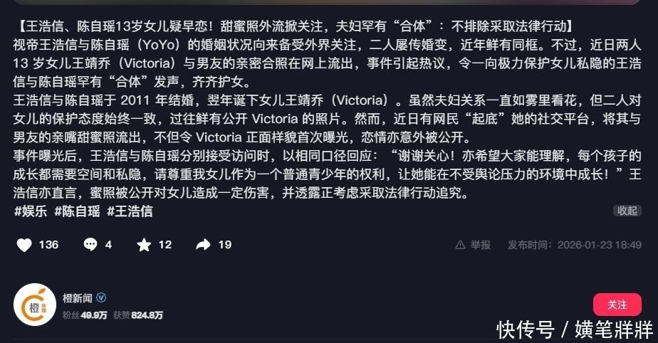 如何在高强度舆论监督下维系家庭基本功能、涵养孩子独立人格、同时完成自我身份重构,已成为王浩信与陈自瑶必须共同作答的时代课题。事件后续进展及其关系演变脉络,仍具极高追踪价值与社会观察意义。